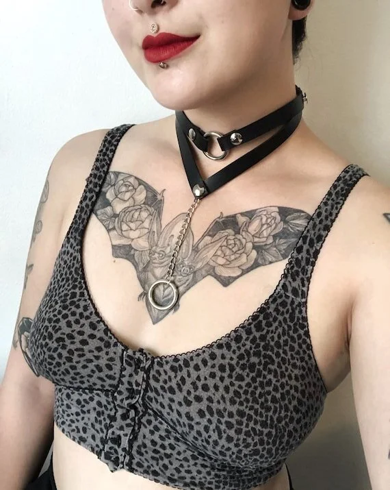 The sharp lines of this collar make it one of the bolder offerings of The Chained Rose, but fear not, the dangling chain and o-ring keeps her lady-like.